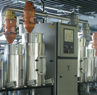 with machines from 25 to 400 t clamping force. The different pellets in customary colours and grades are distributed centrally. Due to the fact that thermoplastic materials in their great